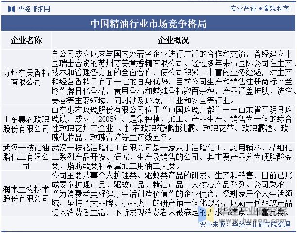 中国精油行业内有大量的中小企业和个体经营者,整体市场呈现出企业数量众多但规模较小的特点。虽然市场上有许多中小企业,但也存在一些具有较强竞争力的龙头企业,苏州东吴香精有限公司、山东惠农玫瑰股份有限公司、武汉一枝花油脂化工有限公司、润本生物技术股份有限公司,这些企业在品牌知名度、产品研发和市场占有率方面具有一定优势。