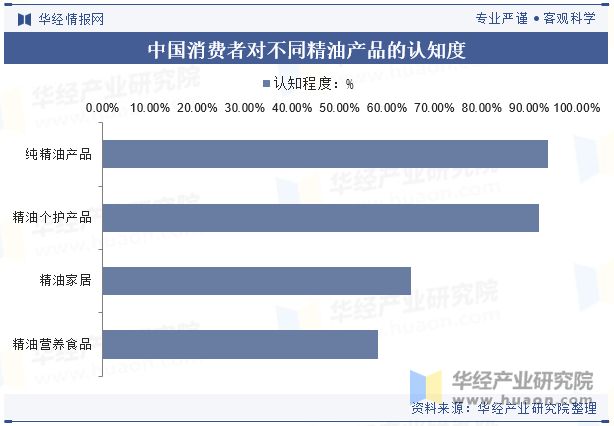 消费者对传统的纯精油产品和个护精油产品的认知度较高,而对精油在家居和营养食品中的应用认知度相对较低。与市场推广力度、产品教育和应用场景的普及程度有关。目前中国消费者对纯精油产品认知程度已达94%,精油个护产品认知度已达 92%。