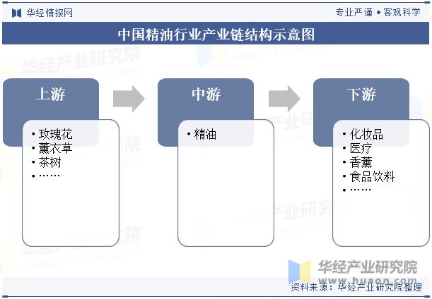 中国精油行业产业链上游为制作精油的原材料,主要为玫瑰花、薰衣草、茶树等;产业链下游精油的应用领域,主要为化妆品、医疗、香薰、食品饮料等。