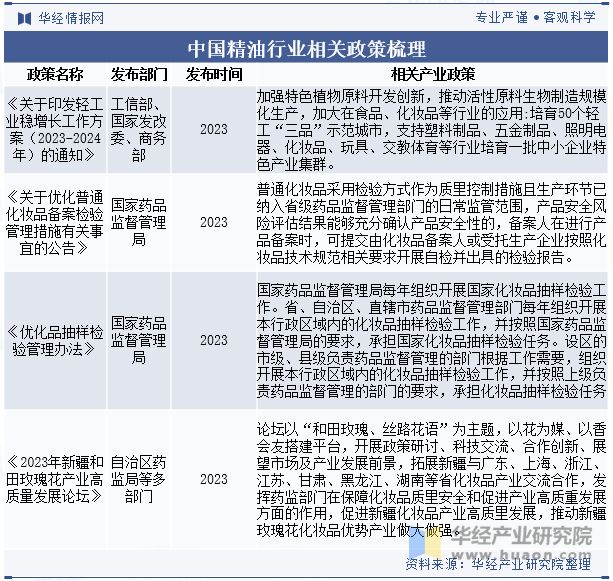 中国政府近年来大力推进环境保护和绿色发展的政策。精油作为天然产品,生产过程对环境的影响相对较小,符合环保要求。因此,环保政策对精油行业的发展有一定的推动作用。2023年《关于印发轻工业稳增长工作方案(2023-2024年)的通知》中提出:加强特色植物原料开发创新,推动活性原料生物制造规模化生产,加大在食品、化妆品等行业的应用;培育50个轻工“三品”示范城市,支持塑料制品、五金制品、照明电器、化妆品、玩具、交教体育等行业培育一批中小企业特色产业集群。
