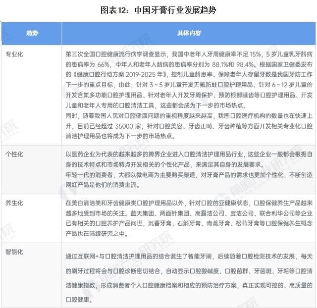 当前,我国经济正处于产业转型升级的关键时期,口腔清洁护理用品行业需要按照高科技、高质量要求进行发展,从而为我国人民提高口腔健康水平做出更大的贡献。未来我国牙膏行业技术将朝着专业化、个性化、养生化和智能化方向发展: