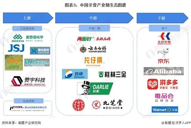 分中国牙膏产业链上代表企业/机构情况,上游原材料供应商主要有新化股份、赞宇科技、美思德、金三江等;中游企业既包括黑人等国外品牌,也包括云南白药、两面针、登康、片仔癀等本土品牌;下游主要为京东、阿里巴巴、拼多多等线上渠道以及华联、沃尔玛等线下商超等。