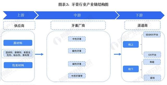 中国牙膏产业链其上游原材料主要包括摩擦剂、湿润剂、粘合剂、表面活性剂、香料及甜味剂以及包装材料厂商等,中游牙膏市场主要为各类牙膏的生产商等,下游为各类线上销售渠道和线下渠道。