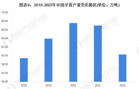 据中国口腔清洁护理用品工业协会数据,2018-2020年我国牙膏产量规模呈逐年增长态势,2020年我国牙膏产量为67.59万吨。2022年中国牙膏产量约60.3万吨,同比下滑10%,主要系受2022年国内新冠疫情升级的影响。