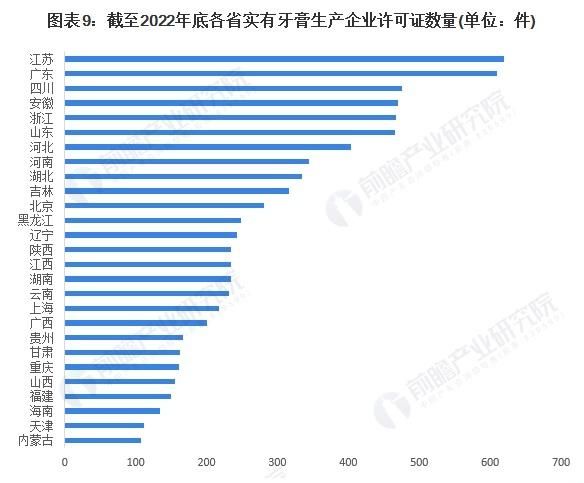 根据国家药监局公布的药品监督管理统计年度数据(2022),中国牙膏生产企业许可证主要分布在江苏、广东、四川、安徽、山东、浙江等地区。